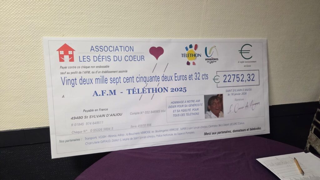 Le collectif Défi du Cœur de Saint-Sylvain-d’Anjou a organisé une soirée dédiée à la remise officielle du chèque à l’AFM-Téléthon, marquant l’aboutissement d’un formidable élan de solidarité.